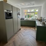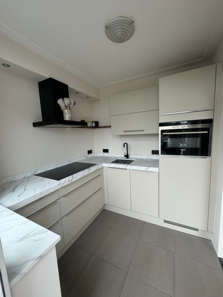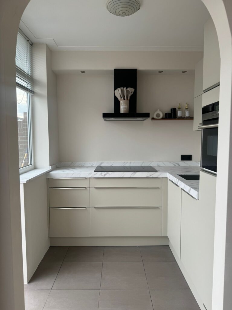 In IJmuiden heeft een saaie witte keuken een prachtige transformatie ondergaan door middel van keukenwrapping. Voorheen was de keuken saai en eentonig met haar volledig witte uitstraling, maar nu straalt ze warmte en moderniteit uit. De kastdeuren en lades zijn omgetoverd tot een stijlvolle taupe kleur, wat een subtiele maar aanzienlijke verandering teweegbrengt. Dit zorgt voor een gezellige sfeer en een eigentijdse look.